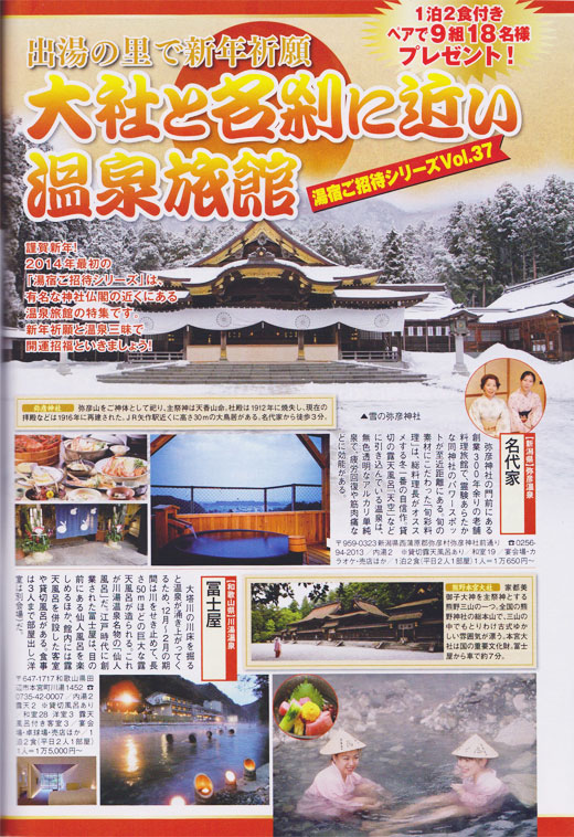 総合週刊誌『週刊実話』2014年1月23日号の「出湯の里で新年祈願 大社と名刹に近い温泉旅館」で、九兵衛旅館をご紹介いただきました。